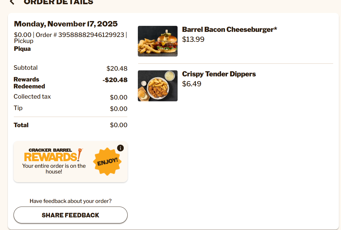Cracker & Barrel | 225+ Points [1x Free Entrée]
