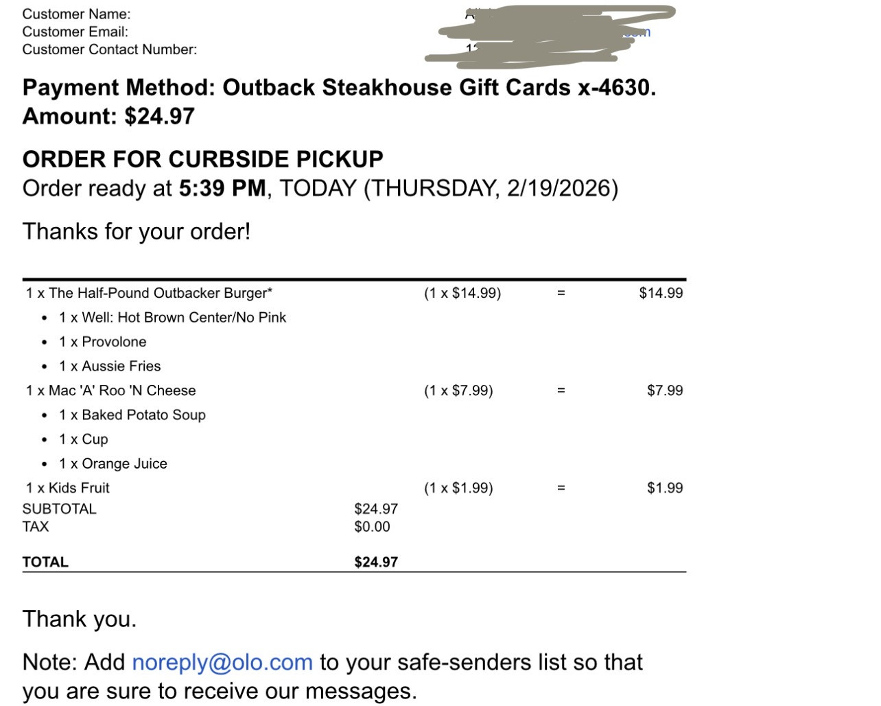 Outback Steakhouse | $25 - $30 GC:PIN
